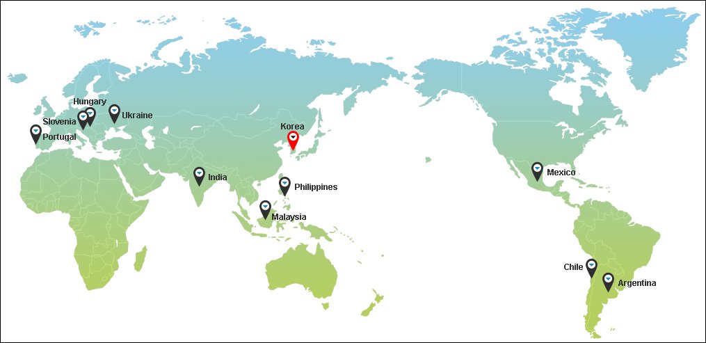 (Slovenija, Madžarska, Portugalska, Češka, Ukrajina, Indija, J.Koreja, Malezija, Filipini, Mehika, Čile, Argentina)